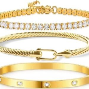 18K Gold Plated Love Bracelet Set, Zircon Adjustable Bracelet Horseshoe Buckle Cable Bracelet, 3-Piece Women’s Stackable Gold Bracelet Jewelry Set