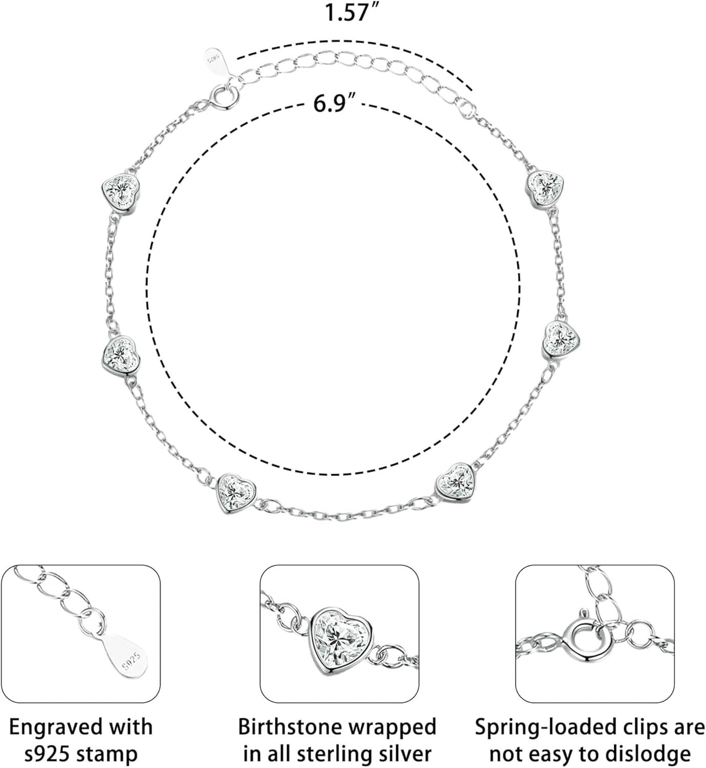 - ADJUSTABLE FIT:April birthstone bracelets features a stunning AAAA+ heart-shaped Cubic Zirconia,The transparent heart stone adds a touch of elegance, symbolizing love and strength.The sterling silver birtnstone bracelet comes with an adjustable chain, allowing for a comfortable and fit on any wrist size